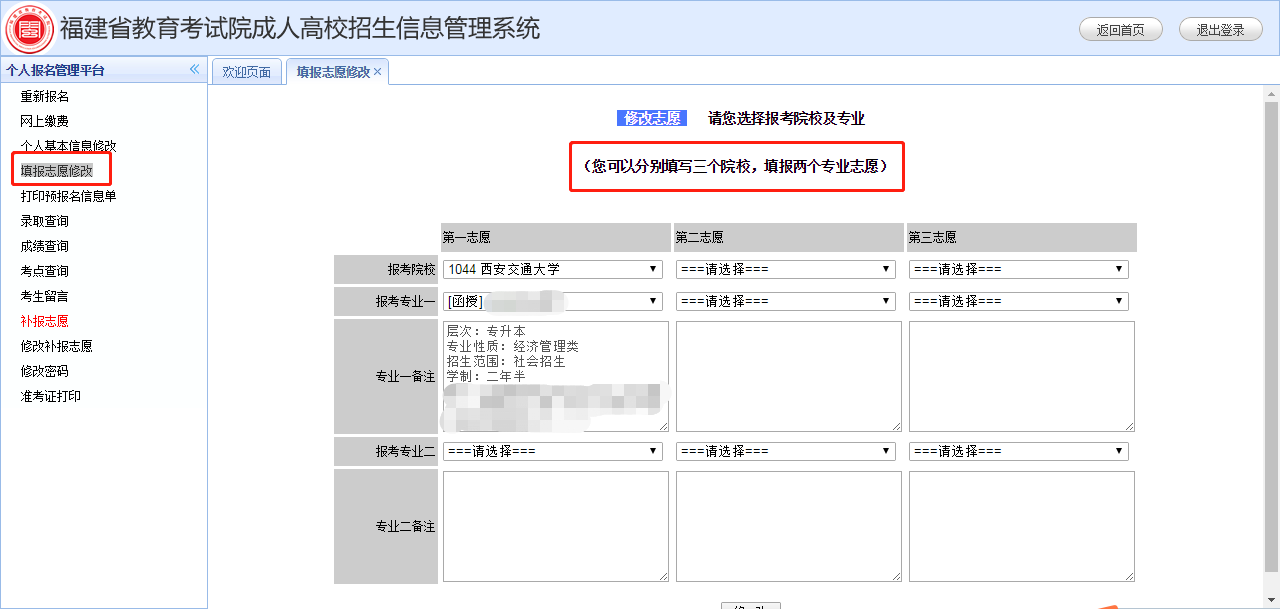 2、 憑個人賬號密碼對報名時填報的專業志愿信息進行第二次確認,考生可對報名時填報的專業志愿進行調整。(如下圖)