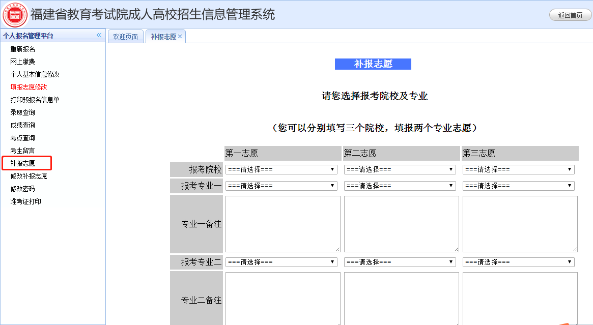 志愿補報地址:http://www.49251.cn/cjcx (此地址也可以查詢錄取結果),點擊進入,使用用戶名和密碼登陸,點擊左側“補報志愿”。