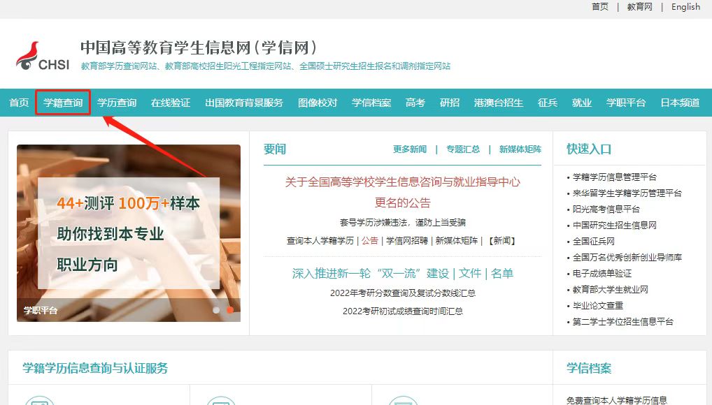 1、考生在進入學信網(wǎng)后,點開“學籍查詢”。