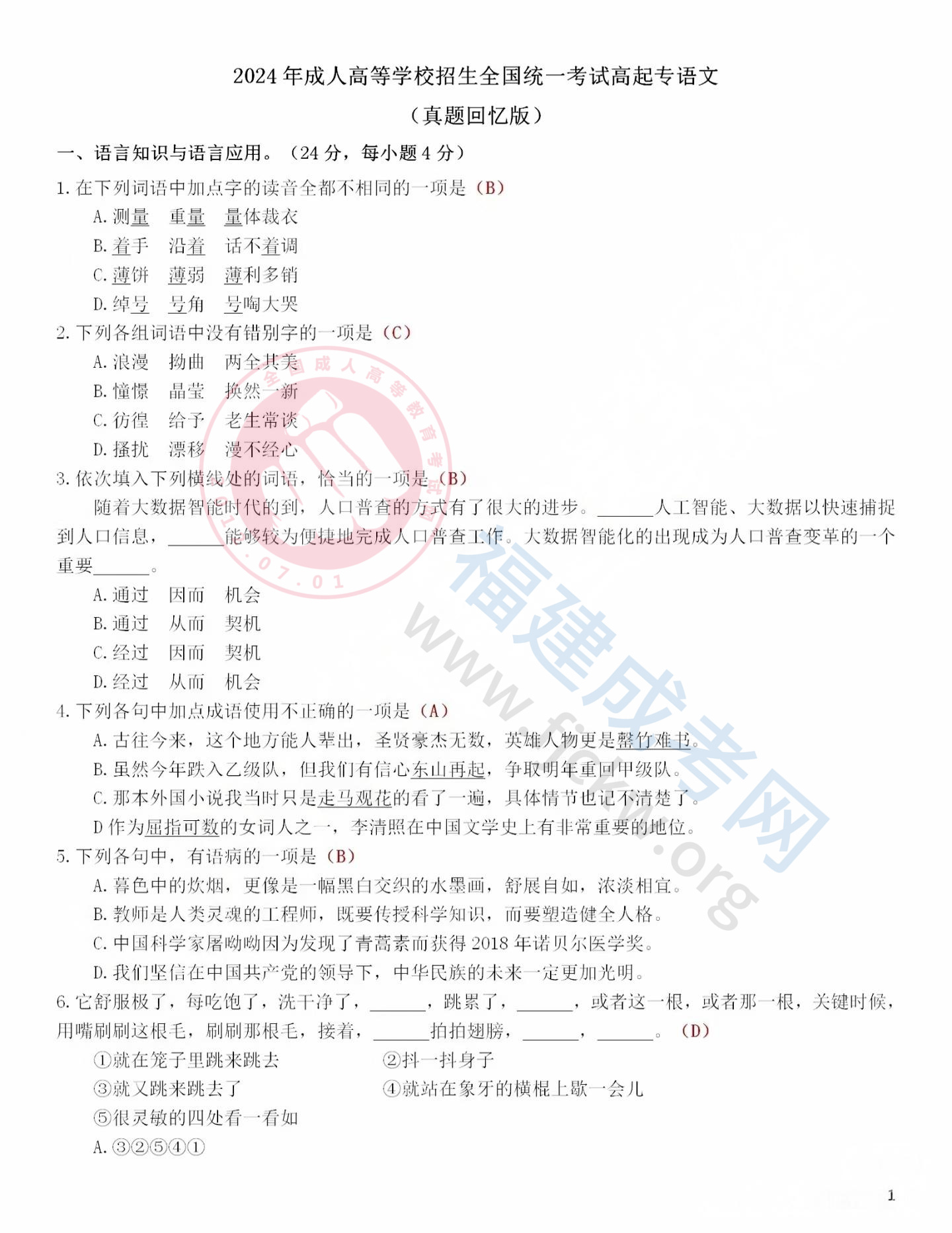 上一篇:2024年福建成人高考高起專語文模擬卷及答案(六)